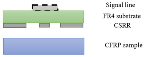 The microwave planar resonator is a method in microwave NDT testing. A complementary split-ring resonator (CSRR) was developed in [43] instead of a resonant cavity. As illustrated in Figure 11, the CSRR was located on the lower side of the FR4 substrate, while the microstrip line was made on the upper side for signal feed. During testing towards the CFRP sample, two coaxial cables connected the HP 3720D VNA (HP Inc., Palo Alto, CA, USA)to the sensor, which was located above the CFRP sample with a standoff distance of 100 µm. The defects in the CFRP sample were detected by measuring the part of the sample without any defects as a reference to the part with defects. According to the results obtained, the resonant frequency shifts if and only if any defects exist.