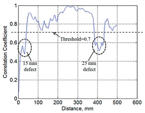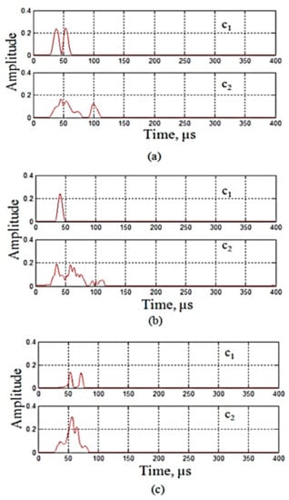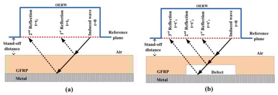 Reflection from internal defects in composite materials can be modeled as a reflection of partial wave [22]. The acoustic impedance of composite material is usually expressed as , where is the longitudinal wave velocity, and is the density of the composite material [22]. Internal defects in the composite material are modeled as impedance discontinuities that cause partial reflection of the wave upon its incidence. Thus, this technique is able to detect any slight change in the density of the composite material as the partial reflections are tracked in amplitude and time.