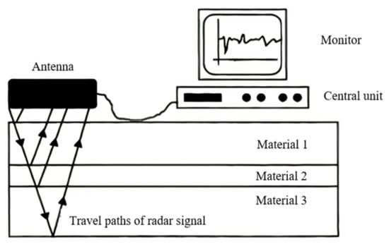 Ground-penetrating radar (GPR) is a subsurface imaging technology method of NDT where the electromagnetic wave, typically in the 1–1000 MHz frequency range will transmit into the material under investigation [61]. The basic principles of radar wave propagation, reflection, and transmission were employed while investigating the material. According to [62], the electromagnetic wave will reflect at interfaces and objects within the material. Analysis of the results obtained will be useful in determining the location and depth of the detected interfaces and buried objects. There are two basic types of radar wave such as pulse and continuous wave. Based on the method of NDT discussed, pulse radar waves are employed to investigate the material as it will transmit a burst of radar energy and the echoes will be reflected back to the same antenna. The short pulse radar waves will propagate through the layers of material which is under investigation. Figure 13 shows the principle of GPR where the sensor and software pulse EEKO100 GPR system with an antenna for transmission and reception of electromagnetic waves is connected to the computer [63]. A structure with three different materials is used to study the principle of GPR. The signal of GPR is emitted via an antenna. Reflection of signals is happening at the interfaces between the materials and interfaces with the surrounding medium. Receiving the reflected signals by the same antenna represents one scan. The process is repeated to obtain several scans at different locations of the structure for analyzing purposes.