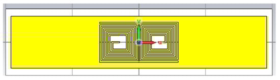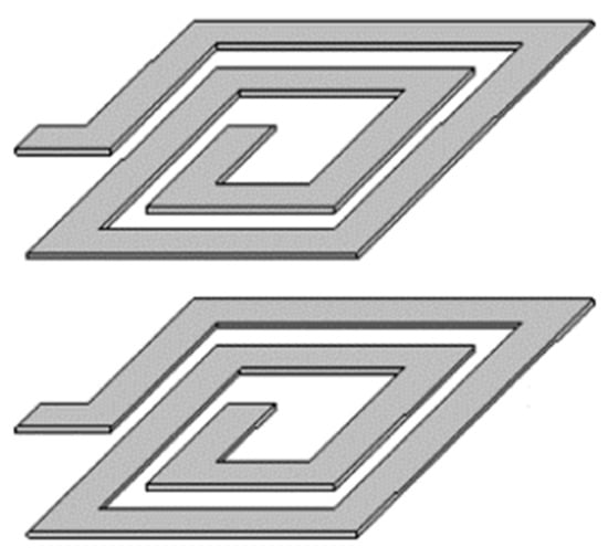 Several orientations of couple spiral inductors can be organized, such as planar coupling between two side-by-side spiral inductors on the same metal layer and vertical coupling of two spiral inductors as shown in Figure 14 and Figure 15, respectively [48]. Planar coupling of spiral inductors is usually fabricated on the underside of the PCB. Two-port sensing devices are made as the inductor connected to a coplanar transmission line on the top side. Several parameters such as couple spiral inductors’ geometry like several turns of the coils, frequency, and standoff distance are considered in estimating the sensitivity of the transmission coefficient of the sensor. The principle used in defects detection is based on the scattering transmission coefficient, S12, which indicates the transmission of relative power from the primary spiral to the secondary spiral as S12 has a greater signal-to-noise ratio than the other S-parameters. Whenever any defects exist in the materials under inspection, they disturb the coupling and perturb the transmission coefficient to enable detection and evaluation. In other words, the transmission coefficient will change when the coupling region is interacting with a groove where the coupling region will start to move across and leave the boundaries of the groove [72]. The vertical coupling of two spiral inductors is constructed by overlapping two identical spirals. This configuration of spiral inductors is robust which could be used as an on-chip transformer [48].