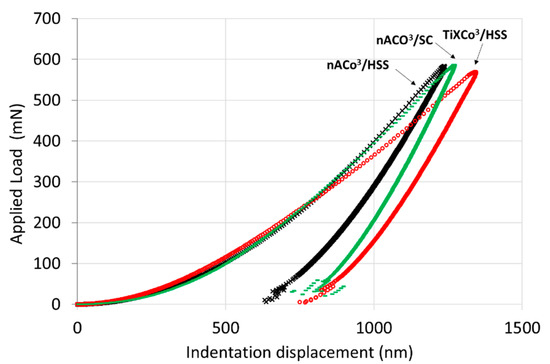 Figure 5 shows the load-displacement curve of specimens deposited with nACo3 and TiXCo3 coatings, indicating the difference in behavior of the coatings.