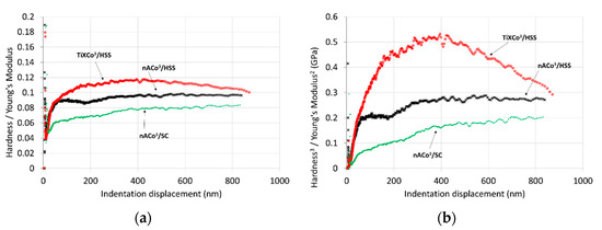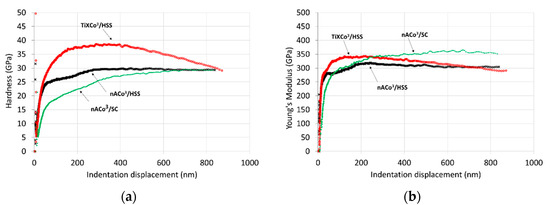 The elastic module curves show different behavior (Figure 6b). There is a difference in the Young’s modulus for the same coating, nACo3, which is caused by the use of different substrates. A decrease in elastic modulus means that the coating exhibits better elastic properties and higher resistance to cracking. The TiXCo3 coating deposited on the high-speed steel (HSS) substrate had approximately the same values of elastic modulus as the nACo3 coating at higher indentation depths. The elastic modulus value was higher at low indentation depths and then began to decrease with the indentation depth. This could be caused by the increase in Si content, which usually leads to a decrease in the mean value of the elastic modulus.