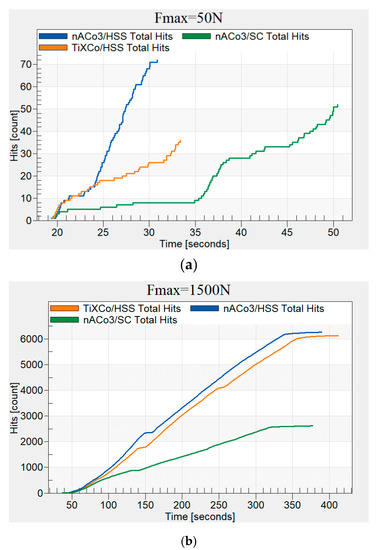 Number of hits (originally exported from Daemon system): (a) Fmax = 50 N; (b) Fmax = 1500 N.