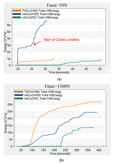 Hits Energy curves for TiXCo3/HSS, nACo3/HSS, and nACo3/SC captured at the maximal force of (a) 50 N and (b) 1500 N.