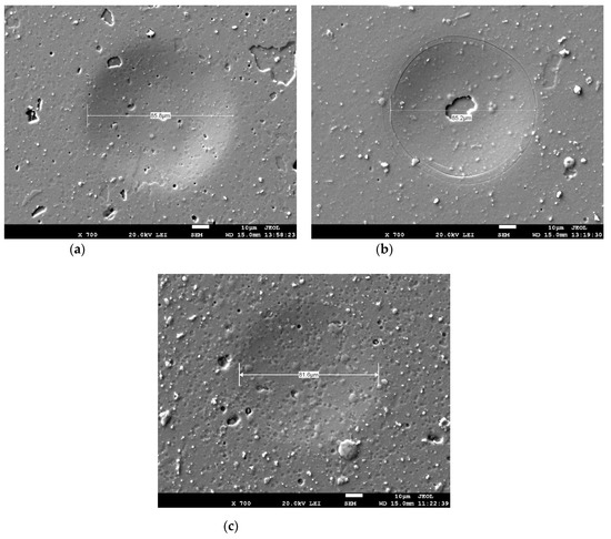 Indentation imprints at Fmax = 50 N: (a) TiXCo3/HSS, (b) nACo3/HSS, and (c) nACo3/SC.