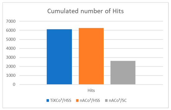 The values of the hits energy curve for the nACo3 coating deposited on sintered carbide (Figure 9b) were the lowest. The hits energy curve of the nACo3 coating deposited on HSS exhibited almost intermediate values. The TiXCo3 coating had the maximum value of hits energy of cracks identified by acoustic emission and most of this acoustic event caused by indentation was related to the creation of cracks which dissipated more energy. This is because when larger cracks are created, more energy is dissipated into the material.
