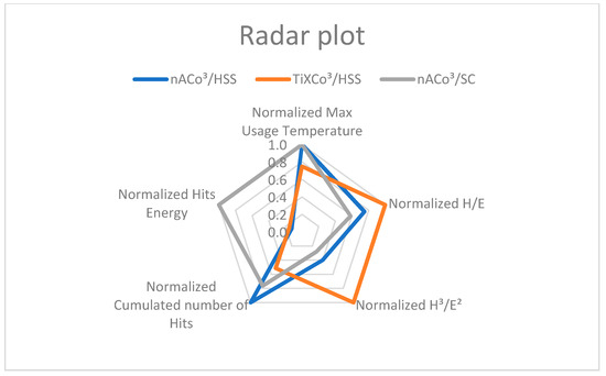Contrary to parameters calculated from nanoindentation tests, where only the coating was investigated, the most durable coating–substrate system at high loads was nACo3 deposited on sintered carbide (Figure 14).