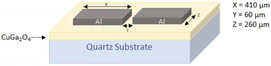 A Veeco Dektak 150 profilometer (Veeco, NY, USA) was used to measure the thickness of the films. The XRD measurements were performed using a PANalytical Empyrean XRD system (Malvern Panalytical, Westborough, MA USA), using radiation from a Cu source at 45 kV and 40 mA. The diffraction patterns were recorded between 2θ angles of 25–70°, and the phase information was analyzed using HighScore Plus software (Malvern Panalytical, Westborough, MA USA). The surface morphology of the film was identified using field emission scanning electron microscope Zeiss ULTRA-55 FEG SEM, (Zeiss Microscopy, White Plains, NY, USA). The optical transmission studies were performed using a Cary 100 UV-Vis spectrophotometer (Varian Analytical Instruments, Walnut creek, CA, USA). In order to perform the optical transmission studies, a wavelength range of 200–800 nm was used for the film deposited on the quartz substrates, and the wavelength range of 300–800 nm was used for the films deposited on the glass substrates. The resistivity of the film was measured by patterning parallel Al contact pads on the annealed CuGa2O4 films. In order to pattern the Al contact pads, a liftoff process was used. Once the contact pad windows were patterned, Al metal was deposited by adopting thermal evaporation. A schematic representation of the configuration used for the electrical measurements, along with the dimensions of the contact pads, is shown in Figure 1. A Keithley 2450 source meter (Tektronix Inc, Beaverton, OR, USA) unit was used to measure the I-V characteristics. From the measured I-V characteristics data, the resistance R was calculated. From the calculated R value, the resistivity (ρ) of the film was identified using the formula mentioned below: