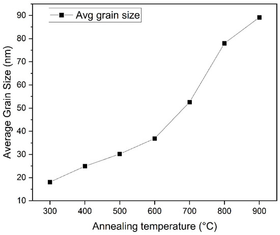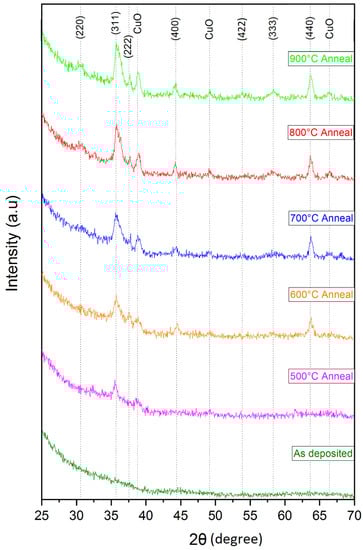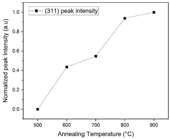 Thin-film XRD diffractograms of the as-deposited CuGa2O4 thin films, as well as films annealed at temperatures varying from 500–900 °C, are shown in Figure 2. The XRD pattern did not display any distinguished peaks for the as-deposited CuGa2O4 thin films or the thin films annealed at temperatures lower than 500 °C. However, the CuGa2O4 thin films annealed at temperatures of 500–900 °C displayed distinguishable peaks. The films annealed at 500 °C showed only two distinct peaks with comparatively lower intensity. They are the (311) peak related to the CuGa2O4 and (111) related to CuO. This suggests that the as-deposited films and the films annealed at temperatures less than 500 °C were majorly amorphous; therefore, for the sake of comparison, the XRD patterns of films annealed at 300 °C and 400 °C are not shown in Figure 2. It is likely that the films require a minimum annealing temperature of 500 °C in order to crystallize. The diffraction peaks identified from the XRD pattern were indexed well with the peaks pertaining to CuGa2O4 (JCPDS PDF # 44-0183). The peaks pertaining to CuO were also identified, suggesting the presence of mixed phases in the deposited thin films. Such a similar presence of CuO peaks along with CuGa2O4 has been previously reported in earlier research [9,20]. The major peaks identified at 2θ of 35.73, 37.68 and 63.59 were indexed to the (311), (222) and (440) phases of CuGa2O4. No peaks pertaining to Ga2O3 were identified. From Figure 2, a steady improvement in the peak intensity and peak sharpness can be noticed with the increase in the annealing temperature, thereby denoting a gradual improvement in the crystallinity. The peak intensity of the strongest peak (311) of CuGa2O4 was plotted as a function of the annealing temperature in Figure 3. A steady increase in the (311) peak intensity with an increase in the annealing temperature is evident from Figure 3.