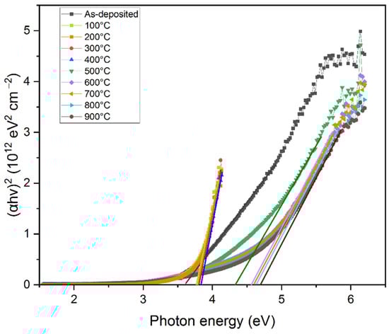 Figure 7 shows the Tauc plot generated using Equations (2) and (3). The linear region of the curves was extrapolated to the x-axis in order to achieve the Eg value. The optical bandgap values displayed an increasing trend with an increase in the annealing temperature. The bandgap of as-deposited film was 3.59 eV, which increased to 4.5 eV for the CuGa2O4 thin film annealed at 900 °C. The bandgap values obtained in this study are comparable to the bandgap values reported for CuGa2O4 thin films deposited using the laser MBE technique [18]. Table 2 shows the variation in the optical bandgap as a function of the annealing temperature. The unique structure and wide bandgap make CuGa2O4 a potential candidate material for ultraviolet optoelectronic device applications [18].