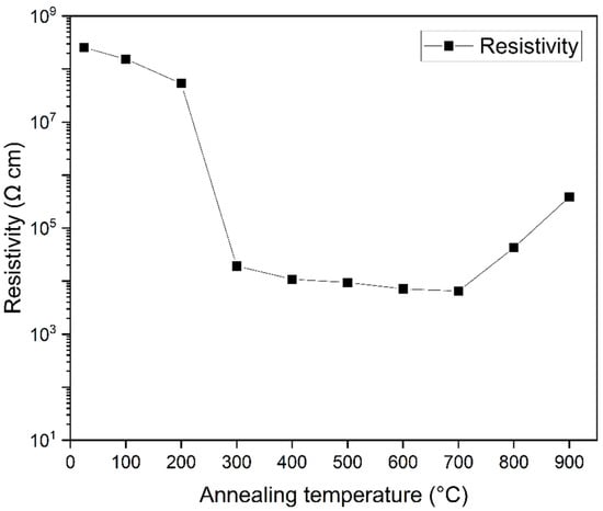 Figure 8 shows the electrical resistivity of the CuGa2O4 films. The electrical resistivities were calculated using the electrical resistance values obtained from the I–V curves. From Figure 8, it is evident that the resistivity showed a decreasing trend with increase in the annealing temperature up until 700 °C (6.4 × 103 Ωcm). This reduction in resistivity could be ascribed to the crystallization of the films. However, the resistivity increased in the films annealed at higher temperatures, with the film annealed at 900 °C showing a higher resistivity of 3.89 × 105 Ωcm. Such similar trends of decreasing resistivity up until a particular annealing temperature, followed by a subsequent increase in the resistivity at higher temperatures have been reported for other compounds belonging to the cubic spinel family [25]. Because there are no observed changes in the structural diffraction phases of the annealed films, the effect of annealing on the resistivity is primarily related to the grain density and grain boundaries. A similar increase in resistivity at very high annealing temperatures, despite with steady increase in the diffraction peak intensity (XRD peaks), has been previously reported in compounds belonging to the cubic spinel family [26,27]. One of the two plausible reasonings behind the increase in resistivity at higher temperatures is the decrease in the actual number of grains per volume, as noted from the FESEM image, thereby resulting in reduced carrier transitions [21,28]. This would potentially result in a resistivity increase. The other reason could be the presence of CuO phases in the film. Research conducted by Valladares et al. showed a sudden increase of resistivity in CuO films annealed at a temperature of 800 °C and above [29]. The authors attribute the increase in resistivity to the potential defects in the film. Similarly, the CuGa2O4 films sputtered in this research also showed an increase in resistivity in the films annealed at temperatures 800 °C and 900 °C.