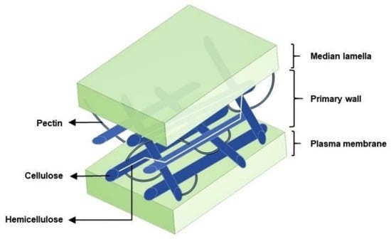 The cell wall of primary plants (Figure 1) mainly comprises three classes of polysaccharides: cellulose, hemicellulose, and pectin [16,20], which can also be located on the middle lamella of upper plants [9,15,21]. Pectin represents a family of complex polysaccharides that play important roles in plant growth and development, such as mechanical resistance and barrier against the external environment [14]. The cell wall is considered biphasic: the crystalline cellulose microfibrils tied by the hemicellulose are submerged in a matrix similar to pectin and protein gel. The way in which these components are associated with a coherent material remains unknown [22].
