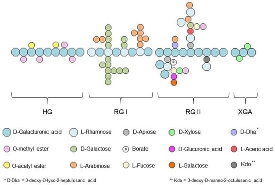 Pectin has a complex structure (Figure 2) composed of its sub-domains, rhamnogalacturonan I (RGI), rhamnogalacturonan II (RGII), and xylogalacturonan (XG), attached to the homogalacturonan (HG) skeleton (information in Table 1) [11]. According to the Food and Agriculture Organization (FAO), the structure of pectin must contain ≥65% galacturonic acid (GalA) [15]. The relation between the units of GalA esterified with methyl and the total units of GalA in the HG skeleton represents the degree of esterification (DE) [9,16,24].