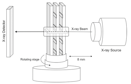 An X-ray microtomography apparatus (Rigaku Nano 3DX Fuji, Tokoyo, Japan) equipped with L1080 lens that has F.O.V. (field of view) φ3.6 (diameter) × 2.8 (height) mm was used. The apparatus was equipped with two X-ray sources, which were the Mo target with the tube voltage 50 kV and the tube current 24 mA with an 0.1 mm thick aluminum (Al) filter (for generating X-rays with higher energy) and Cu target with the tube voltage 40 kV and the tube current 30 mA (for generating X-rays with lower energy). The samples were put in the sample stage of the apparatus with the distance from the center of the sample stage to the 8 mm lens, and the stage height was adjusted as the six veneer samples were all in the field of view (Figure 4). Sequential image acquisition was implemented and with the angular step 0.2 degree during the sample rotation through 180 degrees. The binning level used in this X-ray machine to reach the good resolution was binning 2 as recommended by Oishi and Tanaka [12]. The exposure time used to reach the good contrast of the image when using Mo with Al filter and Cu X-ray targets were 6 s and 10 s, respectively. After the completion of the image acquisition, the CT reconstruction processes were implemented using the computer connected with the apparatus and thus 1234 16-bit grayscale tomograms with the resolution of 1648 × 1648 (2.2 μm/pixel) were obtained.