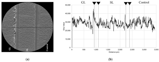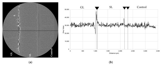 Samples were evaluated by 2D and 3D analysis using ImageJ and VGStudio Max 3.3.4, respectively. 2D analysis in ImageJ was used to obtain gray value plot profile from a line drawn in the middle of the selected image for all the coating materials shown in Table 2. In addition, for the veneers with the three coating materials (GL, SL, and WH), 3D analysis was carried out to complete the color rendering of the coated part of the veneer based on the 2D analysis results.