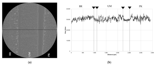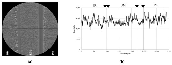 Figure 10 shows a 2D image of wood with brown (BR), ultramarine (UM), and pink (PK) coatings. From this figure, the coatings are visible and can be distinguished based on the grey value on the plot profile.