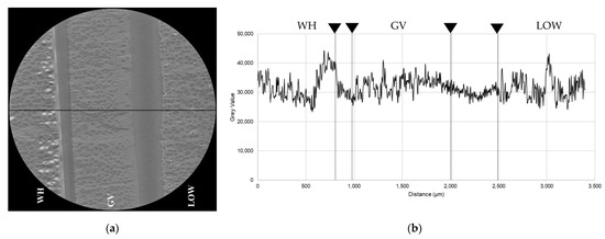 Figure 11 shows a 2D image of wood coated with white (WH), glossy varnish (GV), and light-oak water-based coatings. Based on the image, GV coating is not visible proven by its plot profile which shows no peak in gray value on the wood surface.
