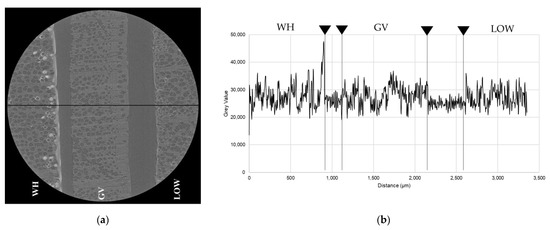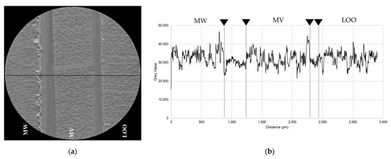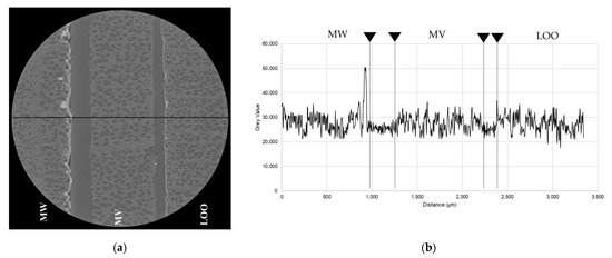 Figure 8 shows a 2D image of wood coated with matte white (MW), matte varnish (MV), and light-oak oil-based (LOO) coatings. Based on the image, the MV sample shows that the coating sample is not visible either on the surface or in the pores of the wood. However, there is a peak in gray value in the profile plot between MV and air, which is thought to be an artifact.