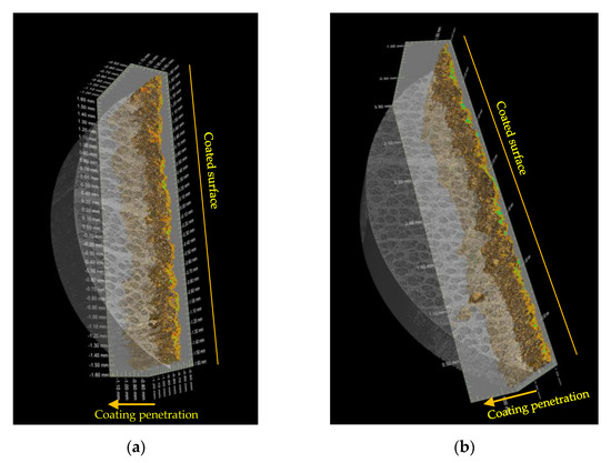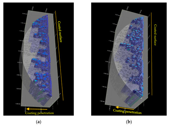 Figure 15 shows a 3D image of wood with WH (white) coatings. The coating side is the blue part on the surface of the wood (right side). Based on the figures, it can be seen that the WH coating is penetrated not only on the wood surface, but also deeply into the wood vessel. Figure 15a indicates the Figure 7 WH and Figure 15b indicates the Figure 11 WH side as the 3D images. The coating is distributed deeply because of the content of the coating materials.