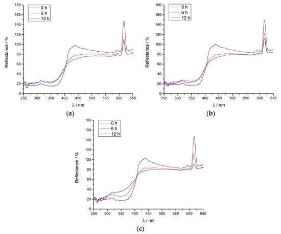 The results of spectral reflectance measurements of the prepared coatings are presented in Figure 4, Figure 5 and Figure 6. In Figure 4a spectral reflectance of the TB without the FP and without the nanoparticles can be seen. The reflectance over 100% in the area between 420 and 470 nm can be assigned to the optical brighteners in the paper [38]. After the ageing of 6 and 12 h, the reflectance in this area was decreased, and the reflectance in the area between 350 and 400 nm was increased. These changes can be assigned to the changes in the paper due to the process of artificial ageing, since no changes in the surface structure of the TB were visible in ATR-FTIR spectra of the TB (Section 3.3). In Figure 4b one can see the spectral reflectance of the unaged and aged coating containing the 3% of FP mixed in the TB (without the nanoparticles). Peaks detected in the range of 580–630 nm correspond to the spectral reflectance of the used FP. It is visible that the aging process caused a decrease in the spectral reflectance through the visible range spectrum. Obviously, the degradation process in the coating occurred, causing the reduction in the visual effect of the fluorescence.