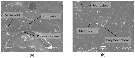 (a) Surface morphology of sample FC + 1.5% TiO2 aged for 12 h (mag. 1600×); (b) agglomeration of polymer spheres (mag. 9000×).