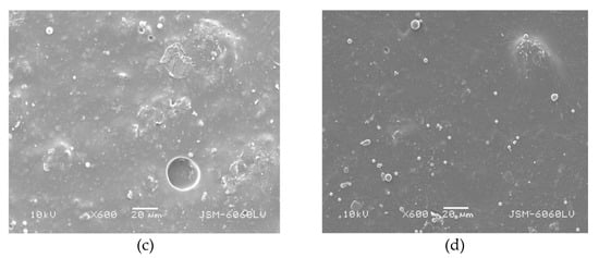 Surface morphology of samples (a) FC + 1% SiO2—unaged, (b) FC + 0.5% TiO2—unaged, (c) FC + 1% SiO2—aged for 12 h, (d) FC + 0.5% TiO2—aged for 12 h (mag. 600×).