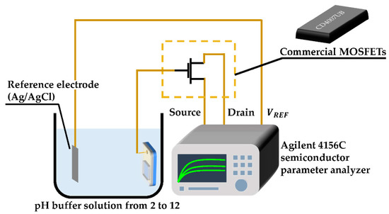 The schematic configuration of InGaO extended gate field-effect transistor (EGFET) is shown in Figure 1. Before deposition of the InGaO sensing membrane, the quartz substrates were prepared by the following processes. First, the quartz substrates were placed in the ultrasonic oscillator and sequentially rinsed with acetone, methanol, and DI water, respectively. Next, the substrates were then dried by N2 gas and deposited 70 nm titanium conductive film by using E-beam evaporation to serve as a contact electrode. To assure the sensing membrane quality and prevent the influence by other impurities, the chamber was necessarily evacuated to a background pressure of 10−6 torr by a high vacuum pump before processing. The 300 nm InGaO sensing membrane were deposited on the Ti (70 nm)/quartz substrates by RF magnetron sputtering at room temperature, using InGaO ceramic sputtering targets (atomic ratio In:Ga = 9:1, 99.99% purity). According to the sputtering targets, the atomic ratio of indium to gallium was 9:1, the InGaO sensing membrane was represented by In0.9Ga0.1O. During In0.9Ga0.1O deposition, the base pressure, deposited pressure, and RF sputtering power, gas flow ratios of O2/(O2 + Ar) were kept at 3 × 10−6 Torr, 5 mTorr, 100 W, and 20%, respectively. The distance between Ti (70 nm)/quartz substrate holder and target gun was 9 cm, and the angle between the gun and the holder was 30°. The holder was rotated at a speed of 10 rotations per minute to lead the good uniformity of sensing membrane thickness distribution. The completed sensing membrane was connected to the gate of the commercial MOSFETs (CD4007UB) with wire. In order to avoid leakage current, the devices were packaged by epoxy to prevent the reaction between titanium and solution. The size of the sensing widow of 1 cm×1 cm was defined and packaged by using the epoxy resin. To measure the sensing performances of the In0.9Ga0.1O EGFET pH sensors, the encapsulated devices and the reference electrode (Ag/AgCl) were immersed together in the electrolytic solution of the various pH values. The pH value of the electrolytic solution was varied from 2 to 12, which depended on the concentration of the H+ ions. The measuring system constructed by Agilent 4156C semiconductor parameter analyzer was used to verify the performance of the In0.9Ga0.1O EGFET pH sensors. The whole system was shown in Figure 2.