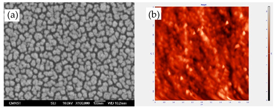 The top-view images of (a) FESEM and (b) AFM of the In0.9Ga0.1O sensing membrane.