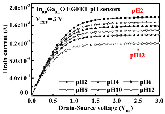 The drain current () and drain–source voltage () varied with the pH value, which can be obtained by the basic MOSFET expressions. Figure 5 shows the – characteristics of the In0.9Ga0.1O EGFET pH sensors operated at a reference voltage () of 3 V with the value of pH buffer solution from 2 to 12. For understanding the – characteristics of the In0.9Ga0.1O EGFET pH sensors in the saturation region, the – curve can be expressed as the following equation [25,26]: