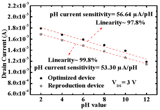 where is the total number of sensing sites per area, and are the acid and base equilibrium constants and is the capacitance of the electric double layer at the In0.9Ga0.1O membrane/pH buffer solutions interface. The sensing mechanism of the In0.9Ga0.1O membrane surface/pH buffer solutions interface could be described by using the Gouy–Chapman–Stern mode [32]. When the In0.9Ga0.1O EGFET pH sensors were immersed in the pH buffer solutions interface, the cations and anions were distributed between the reference electrode (Ag/AgCl) and In0.9Ga0.1O membrane. The electric double layer was formed on the interface and composed of space charge from the electrolyte. The capacitance () value dependent on the reaction of ions absorption and desorption from the electric double layer. In general, the pH sensing properties of EGFET pH sensors affected by the surface potential voltage (). According to the reason mentioned above, the drain current () in saturation region ( = 3 V) shift downward with increasing pH value was obtained and shown in Figure 6. To find the properties of the In0.9Ga0.1O EGFET pH sensors, the pH current sensitivity could be derived from the linear relation between the drain-source current and the pH value. As shown in the Figure 6, the derived pH current sensitivity of the optimized and reproduction device was approximately 56.64 μA/pH and 53.30 μA/pH, corresponding to the linearity of 97.8% and 99.8%, respectively.