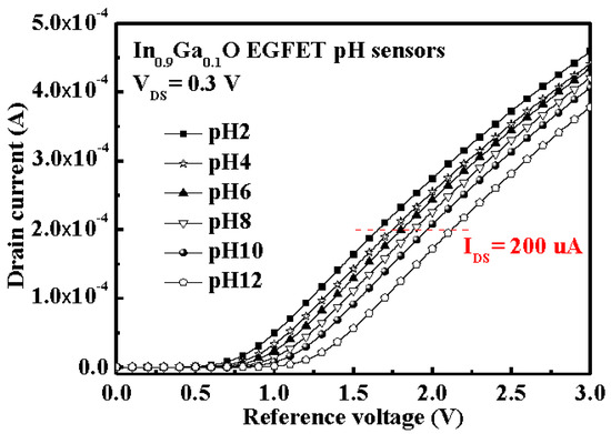 Figure 7 reveals the transfer characteristic curves (–) characteristics of the In0.9Ga0.1O EGFET pH sensors with the pH value from 2 to 12 at a fixed drain–source voltage of 0.3 V. The – characteristics of the In0.9Ga0.1O EGFET pH sensors in the linear region can be expressed as following equation [26]: