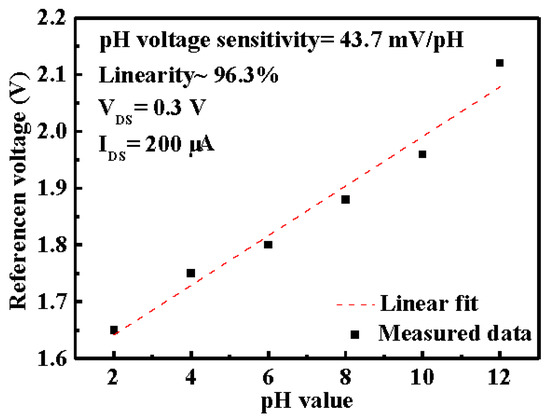 Figure 8 reveals the characteristics of versus value derived in the linear region of the – curve at a fixed of 0.3 V and of 200 μA. The values of were 1.65 V, 1.75 V, 1.80 V, 1.88 V, 1.96 V, and 2.12 V for various pH values range from 2 to 12, respectively. As shown in Figure 8, the pH voltage sensitivity of the In0.9Ga0.1O EGFET pH sensors was estimated to be 43.7 mV/pH and the corresponding linearity was revealed about 96.3%. It was observed the positive correlation between and pH value and exhibited great linearity.