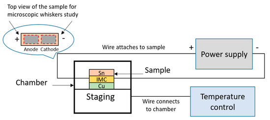 There were two tests were carried out. The first set of samples was subjected to electromigration testing conditions. The testing was carried out in room temperature. The sample was connected with the current stressing at a current density of 1 × 103 A/cm2 at room temperature, while the second set of samples was the electromigration with the thermal ageing test at temperature of 60 °C and 120 °C. The schematic diagram of the electromigration with the thermal ageing test is shown in Figure 1. The sets of samples were divided into two, one which was for whiskers observation, the other one for IMC observation. For IMC observation, the samples were mounted on the cross section with a combination of resin and hardener. Then, it was ground and polished to reveal the IMC thickness’ layer. The electromigration, with and without thermal ageing, on the Sn whisker growth and IMCs were then determined. The current density was calculated using Equation (1). For the observation of solder microstructures, all cast samples were carefully polished with sandpapers and diamond paste to remove surface scratches, washed with CH3OH, and dried. Optical microscopy was conducted to confirm the microstructural characterizations.