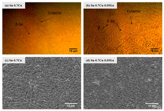 Figure 3 shows the typical micrograph captured by Olympus BX41RF Optical Microscope OM (Tokyo, Japan), on the soldered condition of the bulk microstructure and grain structure of the eutectic Sn–0.7Cu Sn–0.7Cu–0.05Ga solder alloy. The Sn–0.7Cu base alloy has a microstructure composed primarily of β–Sn matrix and eutectic phases, which is typical for Sn–0.7Cu eutectic solders (shown in Figure 3a,b). Although Sn–0.7Cu is near to the eutectic alloy, there are primary β–Sn dendrites in the microstructure. With the addition of 0.05 wt.% Ga, the microstructure of Sn–0.7Cu solder alloy became more refined where more dendritic crystals of β–Sn were formed. During the solidification process, Ga tends to adsorb on the surfaces of crystal planes, as well as the grain boundaries, which acts as a solid solution strengthening [25]. Two major reasons can be attributed to adsorption theory. Firstly, adsorption of Ga lowers the surface energy difference between crystal surfaces. Secondly, due to the pinning effect, the growth rate of the Ga-absorbing crystal surface is reduced, so the grains become smaller and more evenly distributed. Bulk microstructure of the Sn–0.7Cu–0.05Ga affected the morphology and size of the IMCs. Furthermore, Ga’s addition decreased the crystals’ surface energy and allowed smaller grain sizes to exist. This high level of adsorption reduces the free energy in the entire interface as well as the energy differences between crystal planes. In this way, crystals can be prevented from growing, and microstructures can be refined and uniform. As a result, the eutectic phases and β–Sn grains in the solder composed of Sn–0.7Cu–0.05Ga are much finer, and the whole microstructure is more homogeneous than that of the base alloy. Additionally, according to the Hall–Petch relationship, the optimized microstructure can improve the mechanical properties [28]. Figure 3c,d show the dipped solder of different samples that were stripped off selectively using an etching solution of 93% of distilled water, 5% hydroxide, and 2% of ortho-nitrophenol to investigate the evolution of the growth morphology of the intermetallic phase at the Sn/Cu interface. As shown in Figure 3c,d, the interfacial Cu6Sn5 grains are reduced with a Ga addition, while their morphologies remain ovoid.