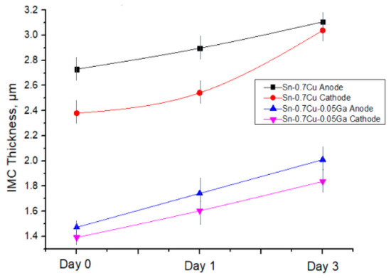 The growth of IMC in field service can affect the strength of solder joints and their mechanical failure. A layer of Cu6Sn5 IMC at the Cu substrate interface of Sn–0.7Cu and Sn–0.7Cu with 0.05 wt.% of Ga was observed on the anode and cathode sides. After current stressing at 30 °C in 3 days with current density of J = 1.0 × 103 A/cm2, the IMC layer formed at the anode was thicker than the cathode (Figure 4 and Figure 5), which could be due to the electron migration from the cathode to anode side because of current flow. This quickens the IMC layer growth, thus creating thicker layers on the solder joints. Initially, the IMC layer of the Sn–0.7Cu solder joint has a thickness of 2.73 μm at the anode and 2.3 µm at the cathode, while the IMC layer of the Sn–0.7Cu–0.05Ga is 1.47 μm at the anode and 1.39 µm at the cathode, which is a decrease of 39% in the cathode and 46% at the anode. After 3 days, the thickness of the pure Sn–0.7Cu increased to 3.22 µm at the anode, while the thickness increased to 3.2 µm at the cathode. In the case of the Sn–0.7Cu–0.05Ga, the IMC thickness increased to 2.62 µm at the anode, while the IMC thickness at the cathode increased to 2.32 µm. The IMC layer for the Sn–0.7Cu–0.05Ga Pb-free solder grew more uniformly relative to that of the pure Sn–0.7Cu solder, recording a 27% decrease on the cathode and 18% decrease at the anode. Figure 5 presents the IMC thickness data for both the anode and the cathode for current stressing up to 3 days at 30 °C with current densities of J = 1.0 × 103 A/cm2. In this case, the data before electromigration is also included as a reference. A parabolic dependence of IMC growth is found at the anode, as well as the absence of current. Compared with the no-current case, IMC grew faster at the anode side and slower at the cathode side. Thus, the polarity of the electric current resulted in enhanced growth of IMC at the anode and retarded growth at the cathode [20].