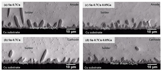 When the ageing temperature was increased to 120 °C with constant current stress, the IMC’s thickness increased. The IMC of the pure Sn–0.7Cu solder on anode was 3.59 µm while the IMC thickness of Sn–0.7Cu–0.05Ga was 2.38 µm. When the heating time was increased to 3 days, the IMC layer thickness of both the pure Sn–0.7Cu and Sn–0.7Cu–0.05Ga Pb-free solder increased to 3.74 µm and 2.46 µm, respectively. The Sn–0.7Cu recorded an increase of 4.2%, while the Sn–0.7Cu–0.05Ga solder recorded an increase of 3.36%. Figure 7 presents the growth of IMC at higher temperature with the same current density of J = 1.0 × 103 A/cm2. It also can be observed that the thickness of interfacial IMCs for all Sn/Cu reaction couples increases gradually as the ageing duration increases, which is ascribed to the interfacial diffusion behavior of Sn and Cu. The IMC on soldered joints shows typical scallop-shape morphology with the phase structure of Cu6Sn5. With the ageing time increased, the IMC layer becomes planar for all joints. The IMC layer’s growth mechanism was dictated by the volume diffusion and interface reaction [20,33]. Ga acted as a solid strengthening agent, where, during current stressing and ageing, it diffuses toward the Sn atom. Ga’s addition prevented the Sn and Cu from diffusing to the anode during the electromigration and thermal ageing test, which leads to the decreasing of IMC thickness.