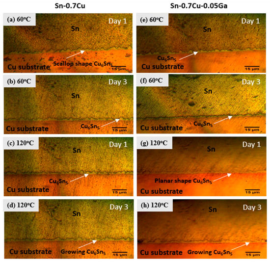 The electromigration effect and IMC formation at different ageing temperatures on the anode side were explored. Figure 6 shows optical micrograph of interfacial microstructure of aged samples at temperature of 60 °C and 120 °C. The image was captured at the anode side after ageing. A layer of Cu6Sn5 IMC layer was detected at the Cu substrate interface of Sn–0.7Cu and Sn–0.7Cu–0.05Ga solders. At the ageing temperature set up at 60 °C with constant current stressing of J = 1.0 × 103 A/cm2 for 1 to 3 days, it was seen that the IMC layer thickness was considerably thicker compared to the IMC thickness at room temperature. The anode of the IMC thickness of Sn–0.7Cu and Sn–0.7Cu–0.05Ga solder under different condition and times are shown in Figure 6. In the pure Sn–0.7Cu Pb-free solder, the IMC thickness is 3.27 μm, while the IMC thickness of Sn–0.7Cu–0.05Ga Pb-free solder is 2.27 µm. When the ageing time was increased to 3 days, the IMC layer’s thickness grew to 3.29 µm for Sn–0.7Cu solder, while the thickness of the IMC layer increased to 2.36 µm for the Sn–0.7Cu–0.05Ga solder. The thickness of the interfacial IMC of Sn–0.7Cu–0.05Ga is thinner than that of the IMC of the pure Sn–Cu solder. It was a 0.6% increment for the Sn–0.7Cu and a 3.9% increment for the Sn–0.7Cu–0.05Ga solder. The IMC increment was considered significant.