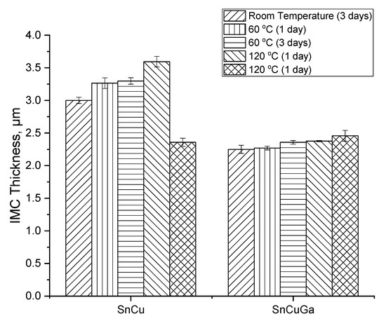 - The thickness of the IMC of Sn–0.7Cu and Sn–0.7Cu–0.05Ga increased from 0.6% to 4.2%, corresponding with the increasing number of ageing temperature and ageing time.