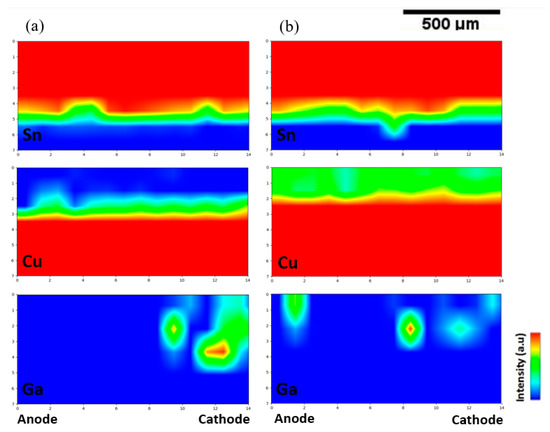The elemental distribution was mapped using the synchrotron micro-XRF, as it allows for the identification of elements that are difficult to be accurately identified using conventional analysis methods such as energy dispersive X-ray (EDX) analysis. Figure 8 shows the elemental maps, and it can be seen that the main elements in the sample are Sn and Cu. Due to low signals, Ga is seen to be distributed randomly in the β–Sn region on both samples under electromigration with and without thermal ageing, as per Figure 8a,b. The bright red color represents the high concentration of the element in the marked area, while the dark blue color represents the element’s lowest concentration. It is believed that there is a migration of atom from cathode to anode. After the electromigration test (a), all atoms migrated to the anode, while Sn and Ga’s concentration decreased at the cathode. The diffusion of Sn atoms from the coating to the Cu lead frame was suppressed by the Ga elements in the Sn–0.7Cu–0.05Ga/Cu solder joint. Ga also slows Cu diffusion into bulk Sn. After electromigration with a thermal ageing test (b), the diffusion of Cu increased.