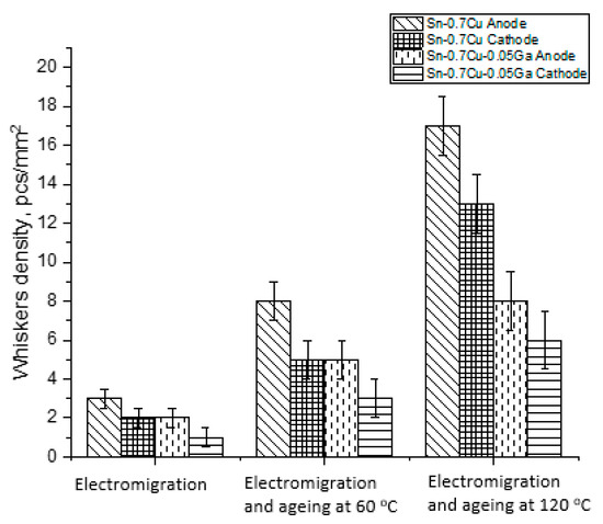 The average densities of the whiskers were plotted in Figure 10 using a quantitative measuring method. The number of whiskers is higher at anode side for all conditions. The average whisker density of the Sn–0.7Cu–0.05Ga was lower than the average whisker density of the Sn–0.7Cu. Initially, the lower whiskers on the cathode side happened because of the migration of atom from cathode to anode. After being thermally aged at 60 °C, the number of whiskers increased. When the temperature increased to 120 °C, the whisker density also increased. However, there was less whisker growth on the Sn–0.7Cu–0.05Ga solder’s surface, which could be due to Ga acting as a solid-solution strengthening agent. Ga also has an effect on Cu diffusion [21,25].