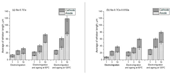 The average length of Sn whiskers after electromigration with and without thermal ageing at 60 °C and 120 °C, at anode and cathode side, after 1, 3, and 10 days: (a) Sn–0.7Cu; (b) Sn–0.7Cu–0.05Ga.