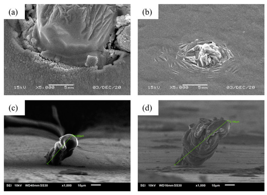 Different types of whiskers growing from Sn-based: (a) Sn whiskers formed from the crack region, (b) Sn whisker growth from compressive stress around it, (c,d) JEDEC measuring of irregular shape of whisker.