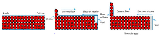 The term electromigration refers to the displacement of metal atoms in conductors. It is a diffusion process of solids driven by electric current [18]. In order to manifest this phenomenon, the current density must be sufficient to cause a drift in the direction of the electron flow. This can cause the initial microvoids in the conductor at high current densities (from where the material is transported), and hillock formations on the other side of the structure (where the material is deposited) [19]. The current stressing causes the diffusion of Sn towards cathode [20]. The IMC formed from Sn’s and Cu’s reaction breaks the Sn’s surface oxide, resulting in compressive stress in the Sn. Whenever an oxide layer is broken at a weak spot, it exposes a stress-free surface that creates a compressive stress gradient, which is relaxed by growing whiskers [21]. Fukuda et al. investigated the whisker growth of bright and matte Sn-plated Cu for an eight-month assessment under electrical current. He reported that whiskers’ growth on both the cathode and anode increased the standard deviation of the length distribution and generated longer whiskers [22]. Lin et al. revealed that the electric current’s stress produced more whiskers, especially at higher current density [23].