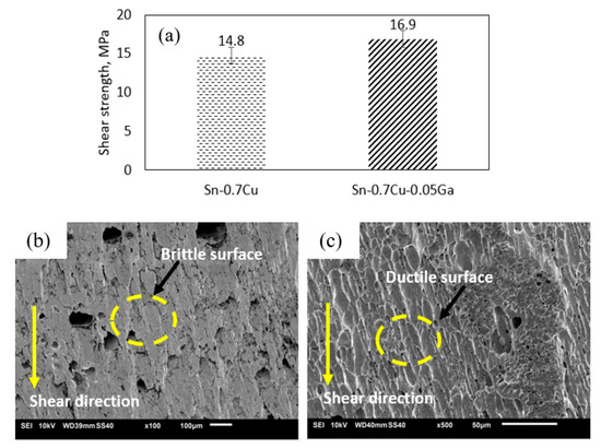 Graph of (a) shear strength and SEM fracture surface image of (b) Sn–0.7Cu/Cu and (c) Sn–0.7Cu–0.05 wt.% Ga/Cu.
