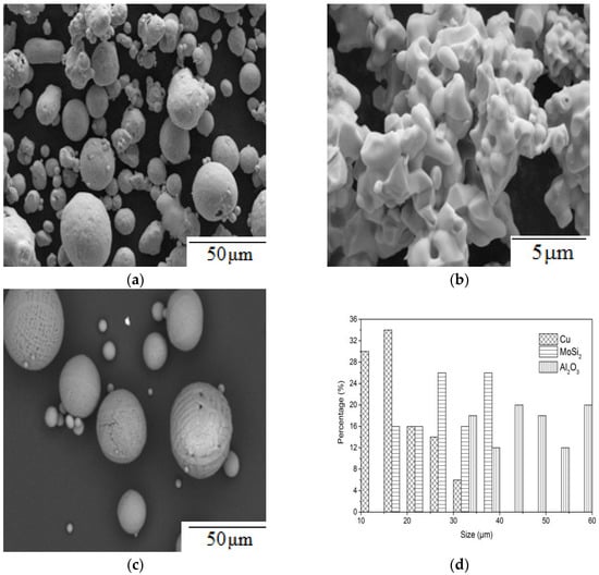 Three-elements distribution on the upper surface of the Al2O3–MoSi2/Cu coating and feedstock: (a) Cu; (b) MoSi2; (c) Al2O3; (d) the corresponding particle size distribution histograms of the Cu, MoSi2, and Al2O3 particles.