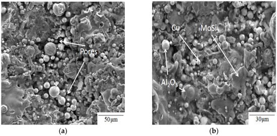SEM micrographs of the Al2O3–MoSi2/Cu coating upper surface: (a) some pores exist in the coating surface (b) MoSi2, Al2O3, and Cu particles.