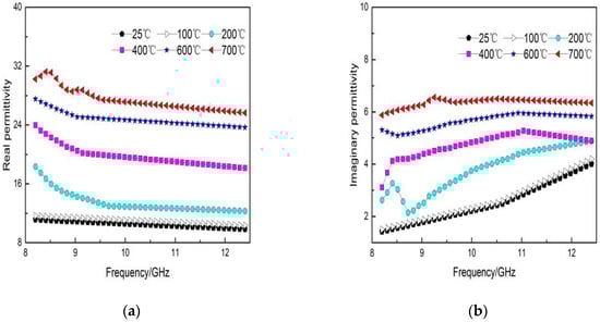 As shown in Figure 7b, ε″ also increases with the material temperature. The material was tested at two different temperatures of 200 and 600 °C, showing that the higher the temperature, the lower the relaxation time. At a high temperature, ε″ can be expressed in Equation (6) [36]: