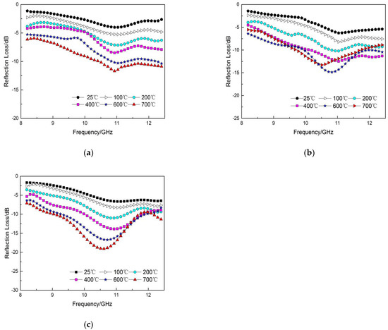 With the increase in coating thickness, the wave absorption performance of the Al2O3-MoSi2/Cu coating gradually increased. The coating’s thickness was 1.0 mm, reflection loss was −3.99 dB, absorbing performance was weak at room temperature (25 °C), absorption frequency was at 11 GHz, the coating’s reflection loss was −11.69 dB, and the temperature was 700 °C. When the thickness of the Al2O3–MoSi2/Cu coating was 1.4 mm, the coating’s minimum reflection loss was −6.66 dB at 25 °C, and the reflection loss of the coating was −19.09 dB at 700 °C. As can be seen from Figure 8c, the coating thickness is 1.4 mm, the reflection absorption frequency gradually moved to the left as the coating temperature increased, which can be explained by Equation (7) [41]. When the coating thickness was the same, the value of ε′ increased with the increase in temperature, which moved the frequency band of the interference from high frequency to low frequency so that the coating reached the role of broadband absorption. Parts of the wave-absorbing performance of the coatings are shown in Table 3.