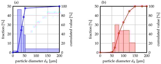 Particle size distribution of the two powder batches used in the present investigation. Nominal distribution: (a) 20–53 , (b) 50–150 , as provided by the material supplier.