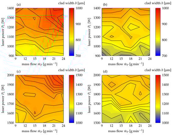 Development of clad width b in dependence on laser power and mass flow . Top: laser beam diameter ≈ 800 , bottom: laser beam diameter ≈ 1200 : (a,c) 20–53 , (b,d) 50–150 .